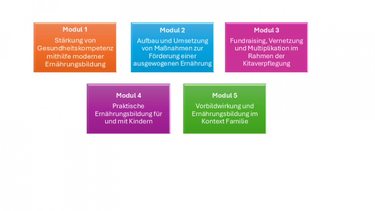 Die erste Säule setzt sich aus fünf Fortbildungs-Modulen zusammen. Darin werden Mitarbeitende aus Kindertagesstätten befähigt, eigenständig Maßnahmen zur Förderung einer ausgewogenen Ernährung in den jeweiligen Einrichtungen umzusetzen: